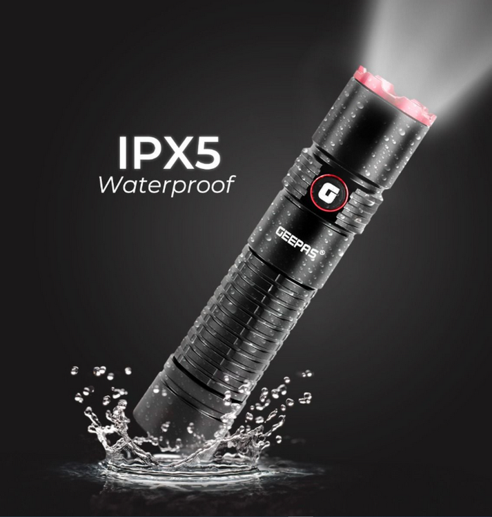 4) ضد آب: این چراغ فلاش قابل شارژ IPX5 ضد آب است و می تواند در باران، برف یا محیط های مرطوب استفاده شود.