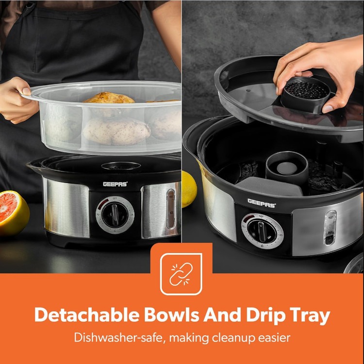 بدون BPA، قابل چیدن و قابل شستشو در ماشین ظرفشویی - همه کاسه های پلاستیکی برای نگهداری آسان و قابل شستشو در ماشین ظرفشویی قابل رویت شدن هستند. مراقب باشید که موتور قابل شستشو در ماشین ظرفشویی نباشد. از آنجایی که غذا در کاسه پایینی سریعتر پخته می شود، همیشه مواد غذایی با زمان بخار طولانی تری را در ابتدا و نزدیک به پایه قرار دهید.