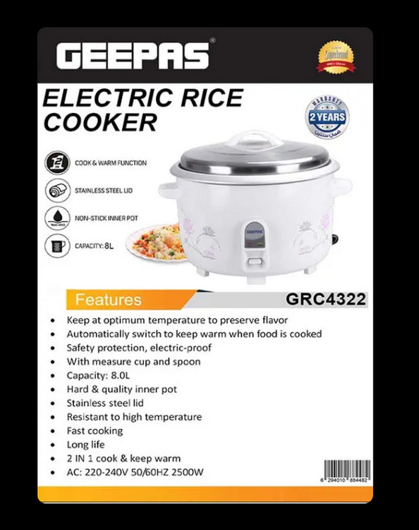 این پلوپز برقی ابتکاری Geepas GRC4322 می تواند غذا را در حجم زیادی به سرعت بپزد. ویژگی "گرم" آن به غذا اجازه می دهد تا در دمای مطلوب باقی بماند، در حالی که دردسر گرم کردن مجدد غذا قبل از سرو را از بین می برد. دیگ داخلی با کیفیت بالا تمیز کردن را آسان می کند. این محصول بادوام همراه با فنجان اندازه گیری و قاشق برای سرو آسان و ویژگی منحصر به فرد ضد شوک الکتریکی است که استفاده از آن را 100% ایمن می کند.