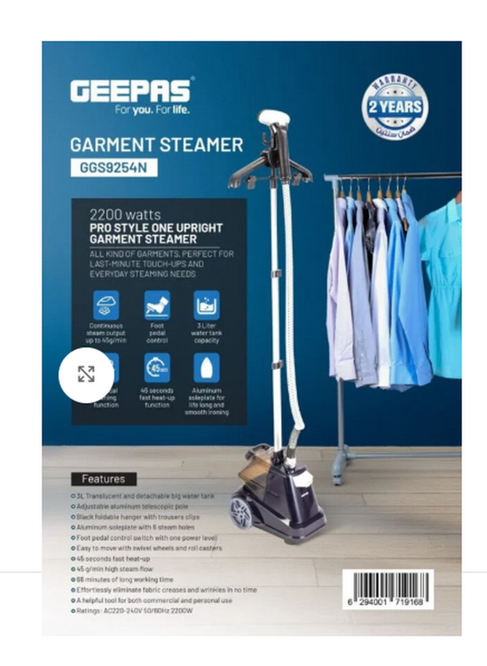 1) بخارشوی لباس: بخارشوی لباس Geepas دارای خروجی بخار قوی 45 گرم در دقیقه و ظرفیت مخزن آب بزرگ 3 لیتری برای عملکرد کارآمد است.