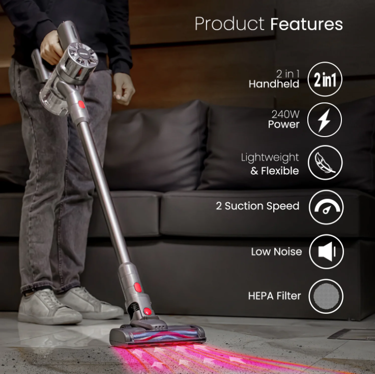طراحی سبک وزن - واحد اصلی تنها 2.0 کیلوگرم وزن دارد، که باعث می شود از این جاروبرقی به عنوان یک جاروبرقی سبک وزن یا یک جاروبرقی دستی جمع و جور استفاده شود. به راحتی می توانید خانه را در هر مکانی بلند کنید و حرکت کنید. این جاروبرقی با ابزار شکاف و برس اضافی ارائه می شود. پس از اتمام کار، آن را روی پایه دیواری که در آن گنجانده شده است ذخیره کنید. ابعاد محصول 105*24*25 سانتی متر می باشد.