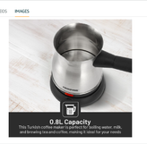 ظرفیت آن 0.8 لیتر است. جنس فولاد ضد زنگ بادوام استفاده چند منظوره، نه تنها برای دم کردن قهوه، بلکه برای دم کردن چای و شیر، با خاموشی غیر خودکار، درجه غذا و نوشیدنی ایمن است، در فضا صرفه جویی می کند و سریع گرم می شود. دارای دکمه سوئیچ روشن/خاموش
