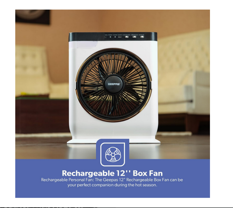 پنکه جعبه ای 12 اینچی شارژی Geepas GF919 | 10 ساعت زمان کار | موتور قدرتمند | پنکه رومیزی شخصی با نور شب LED، 10 ساعت زمان کار