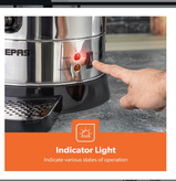 - Once the urn has boiled the water the ‘Heating’ light will go out and the orange ‘Keep Warm’ light will illuminate to indicate that the urn is in a state of preserving heat.