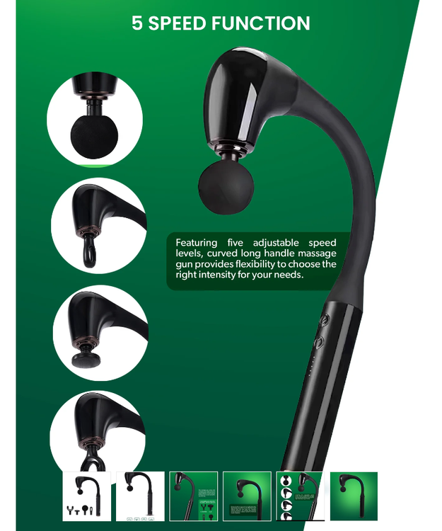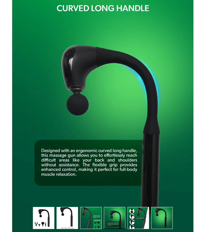 دسته بلند منحنی: این تفنگ ماساژ با یک دسته بلند منحنی ارگونومیک طراحی شده است و به شما این امکان را میدهد که بدون نیاز به کمک، به راحتی به نواحی دشوار مانند کمر و شانههای خود برسید. دسته انعطافپذیر، کنترل بیشتری را فراهم میکند و آن را برای آرامش عضلات تمام بدن ایدهآل میسازد.