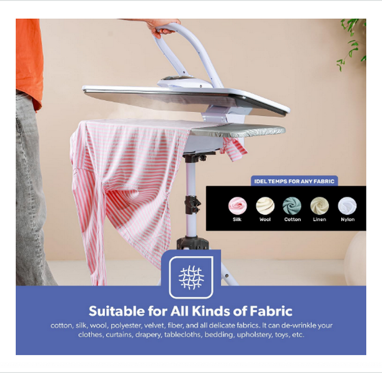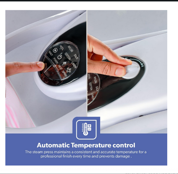 دستگاه پرس بخار برای لباس: دستگاه پرس بخار دیجیتال لباس ما با پایه، دارای یک پنل کنترل آسان برای استفاده است که یک تجربه اتوکشی بینقص را تضمین میکند. کافیست دستگاه پرس بخار را روی لباس خود بکشید و از اتو کردن لذت ببرید!