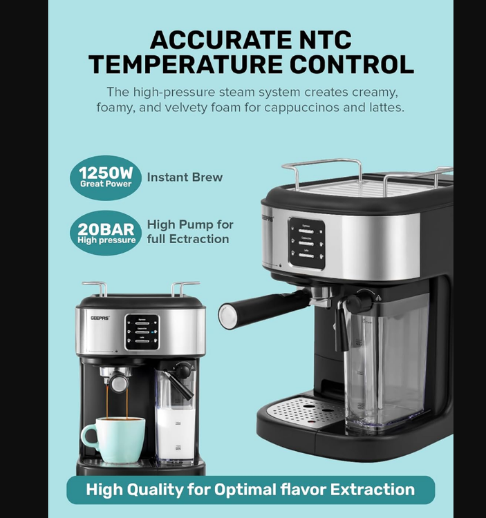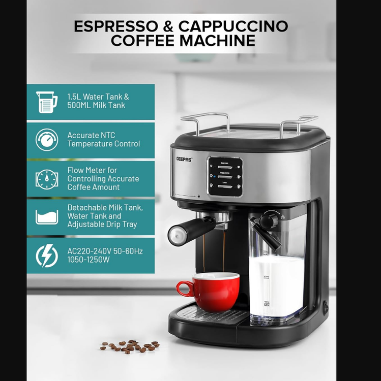 Geepas Espresso and Cappuccino Coffee Machine- GCM1215SA| Equipped with 20 Bar High Pressure Pump and Powerful Steam System.