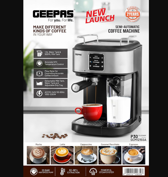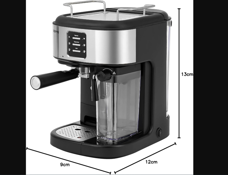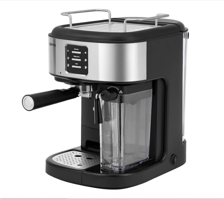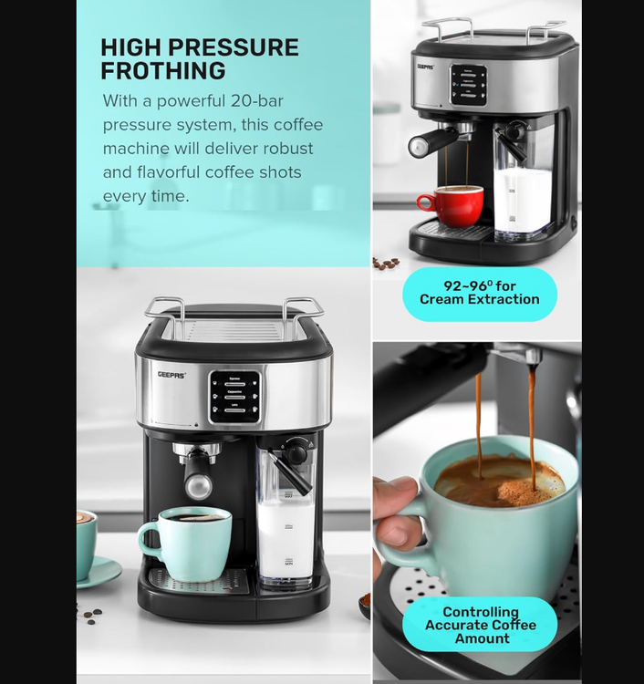 The Geepas espresso and cappuccino coffee machine has a sturdy construction with a powerful steam system and 92–96-degree Celsius extraction.