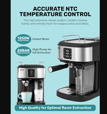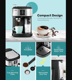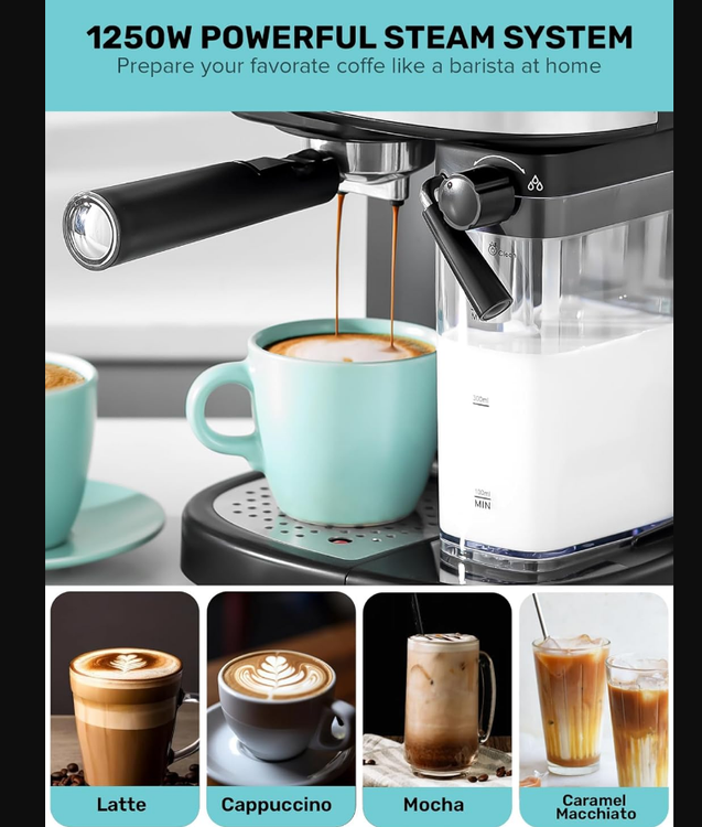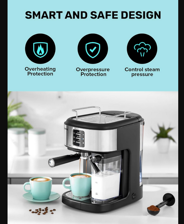 Powerful 20-bar pressure system, this coffee machine will deliver robust and flavorful coffee shots every time. The high-pressure frothing function creates creamy, foamy, and velvety foam for your cappuccinos and lattes