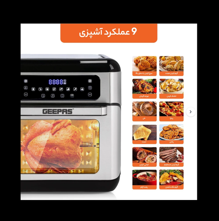 فر سرخ کن 9 در 1 و کارکرد آسان - صفحه نمایش لمسی دیجیتال LED به وضوح قابل مشاهده است. ترکیب سرخ کن توستر با 9 منوی پخت از پیش تنظیم شده، کارهای آشپزخانه شما را به راحتی با لمس حسگر کامل می کند. و تمام نیازهای آشپزی روزانه خود را برآورده کنید، از جمله استیک، مرغ، ماهی، پیتزا، کیک، نان تست، پروف، بال، کلوچه، یخ زدایی، سیخ، ذرت بو داده، سبزیجات، سیب زمینی سرخ کرده، گرم نگه دارید، کم آب کنید.