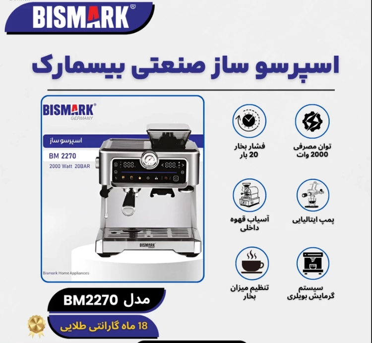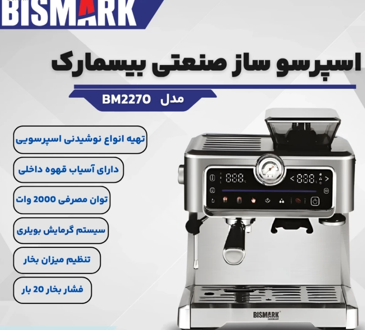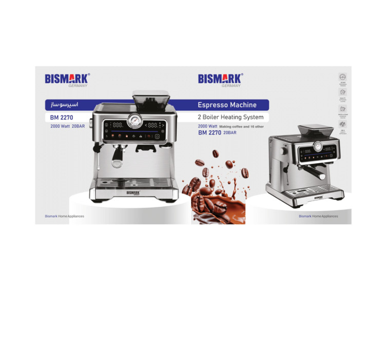 اسپرسو ساز صنعتی بیسمارک مدل BM2270، دستگاهی قدرتمند با توان مصرفی 2000 وات و فشار بخار 20 بار است که مناسب کافهها و محیطهای حرفهای میباشد. این اسپرسو ساز با بدنه تمام استیل مقاوم، دارای دو نازل قهوه، آسیاب داخلی و صفحه نمایش لمسی دیجیتال است که امکان تنظیم دقیق غلظت و بخار قهوه را فراهم میکند. قابلیت استفاده از پودر و دانه قهوه و سیستم کاپوچینو ساز، تنوع بالایی در تهیه نوشیدنیها ایجاد میکند. خرید اینترنتی این محصول با قیمت روز و بهترین قیمت در سایت هووم شاپ، همراه با 18 ماه گارانتی و خدمات پس از فروش، تضمین رضایت شما خواهد بود.