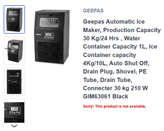 یخ ساز اتوماتیک Geepas، ظرفیت تولید 30 کیلوگرم / 24 ساعت، ظرفیت ظرف آب 1 لیتر، ظرفیت ظرف یخ 4 کیلوگرم / 10 لیتر، خاموش شدن خودکار، دوشاخه تخلیه، بیل، لوله پلی اتیلن، لوله تخلیه، کانکتور 30 کیلوگرم 210 وات مشکی GIM6306
