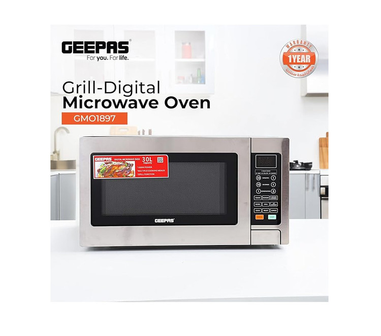 گریل جیپاس GMO1897 - مایکروویو دیجیتال - ظرفیت 30 لیتر - 1500 وات - فر با منوی پخت چندگانه | گرم کردن مجدد، یخ زدایی و گریل | گریل ایدهآل
