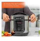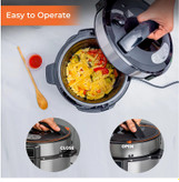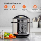 ویژگیها، ۲ سال گارانتی: ۱۴ برنامه پخت با پخت تحت فشار، تایمر و عملکرد گرم نگهداشتن خودکار، صفحه نمایش LED، عملکرد از پیش تنظیم شده ۲۴ ساعته، کنترل فشار خاموش شدن خودکار، دکمههای لمسی آسان برای استفاده، و کاسه نچسب قابل جدا شدن و نمای بیرونی از جنس استیل ضد زنگ. درب قفل شونده هوابند برای ایمنی تحت فشار آببندی میشود.