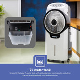 مخزن آب بزرگ - به سادگی مخزن آب بزرگ ۷ لیتری را با آب سرد و بستههای خنککننده پر کنید و به دستگاه اجازه دهید تا به طور خودکار هوا را خنک و مرطوب کند تا هم با گرمای خشک و هم با رطوبت کم مقابله کند. این مخزن بزرگ از پر کردن مکرر مخزن جلوگیری میکند.