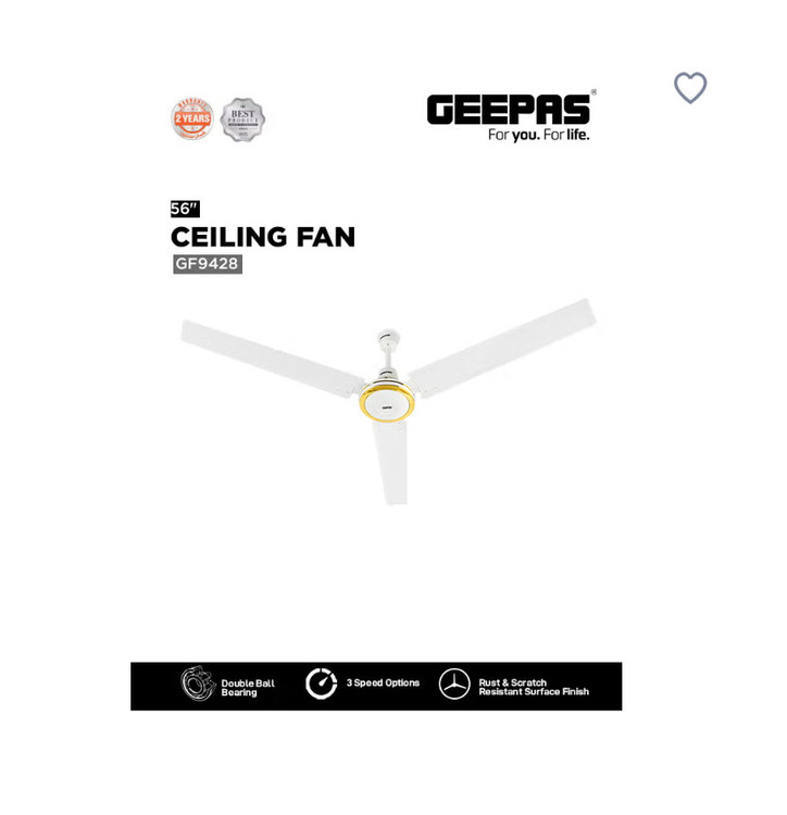 پنکه سقفی ۵۶ اینچی | بلبرینگ دوبل | ۳ سرعته | ۳ پره با باد قوی | پنکه سقفی داخلی با ۲۹۰ دور در دقیقه و بدنه مقاوم در برابر خش | ایدهآل برای اتاق نشیمن، اتاق خواب و دفتر کار، ۷۵ وات، GF9428، سفید