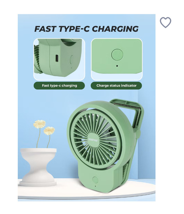با ۳ تنظیم سرعت قابل تنظیم، میتوانید نسیم دلخواه خود را متناسب با نیاز خود انتخاب کنید. باتری قابل شارژ تا ۸ ساعت کار میکند و آن را برای استفاده در داخل و خارج از منزل ایدهآل میکند. با شارژ سریع Type-C، در کمترین زمان ممکن شارژ شده و آماده استفاده خواهید بود. نشانگر وضعیت شارژ شما را مطلع نگه میدارد، بنابراین هرگز از کمبود باتری غافلگیر نمیشوید.
