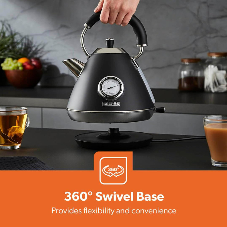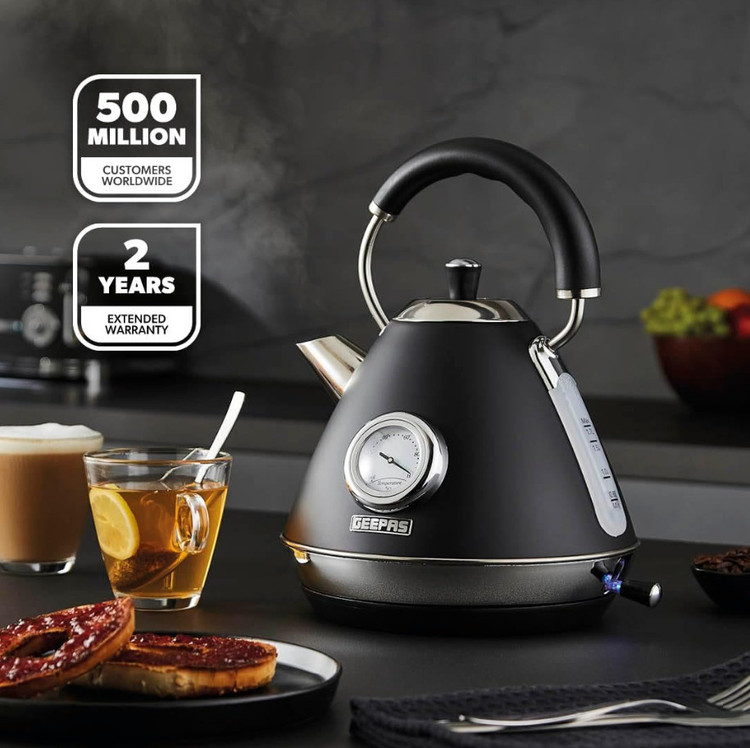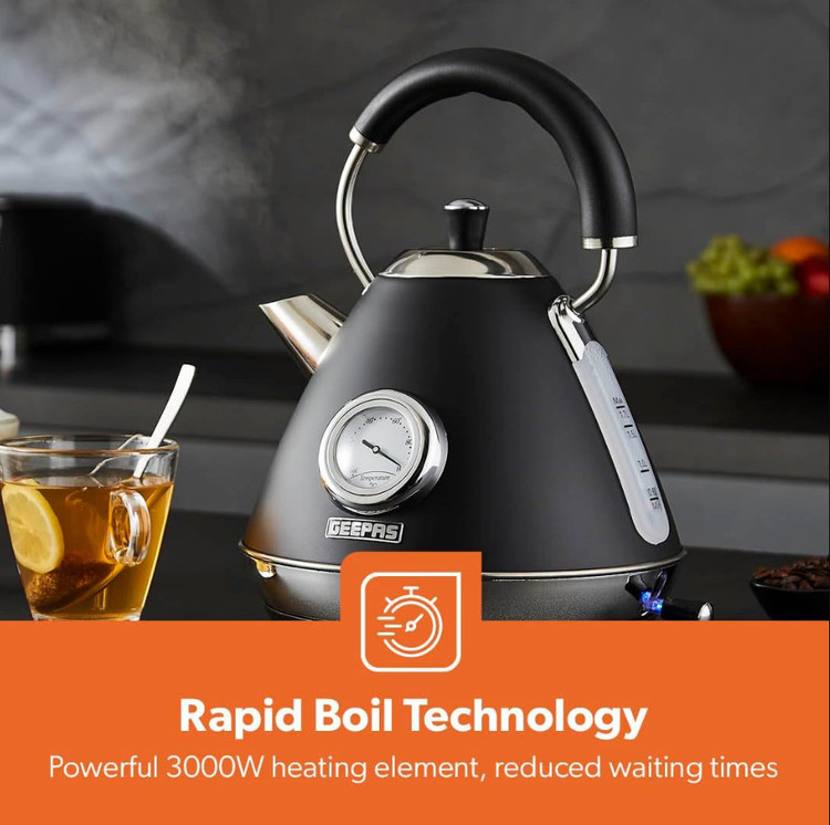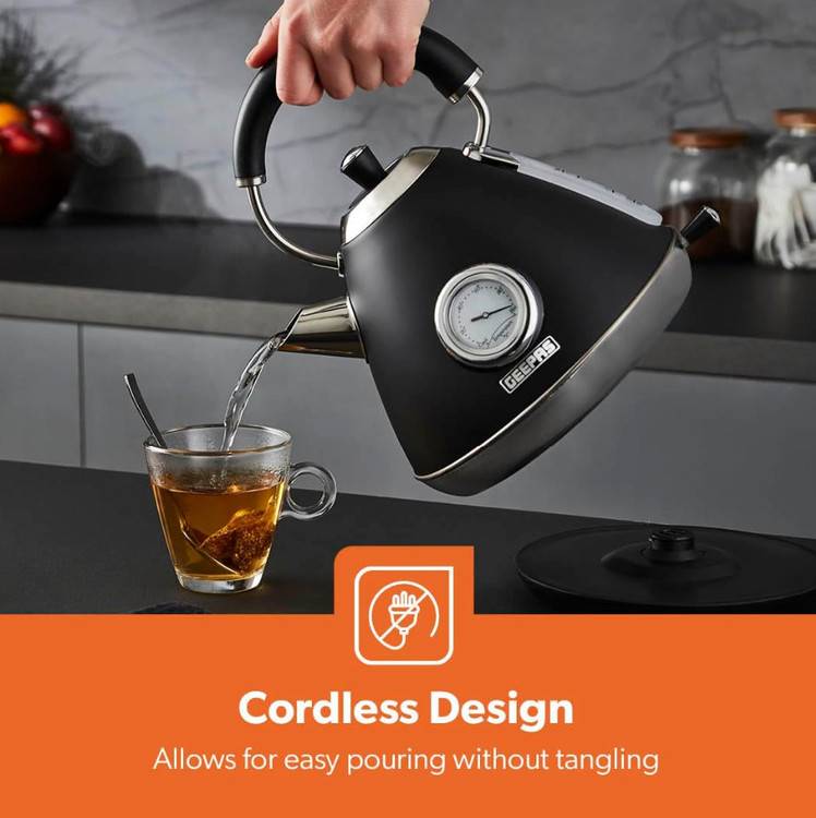 کتری برقی بیسیم استیل ضد زنگ GK38073UK-BK با حجم ۱.۷ لیتر، دارای کنترل Strix، جوشآور سریع ۳۰۰۰ وات، دماسنج داخلی، محافظ جوش خشک، خاموش شدن خودکار، فیلتر جداشدنی.