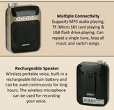 بلندگو از کارت TF، USB و عملکرد ضبط پشتیبانی میکند، برای انجام چندین عملکرد با پورت USB داخلی، کارت خوان TF، ورودی میکروفون و ورودی کابل AUX طراحی شده است.