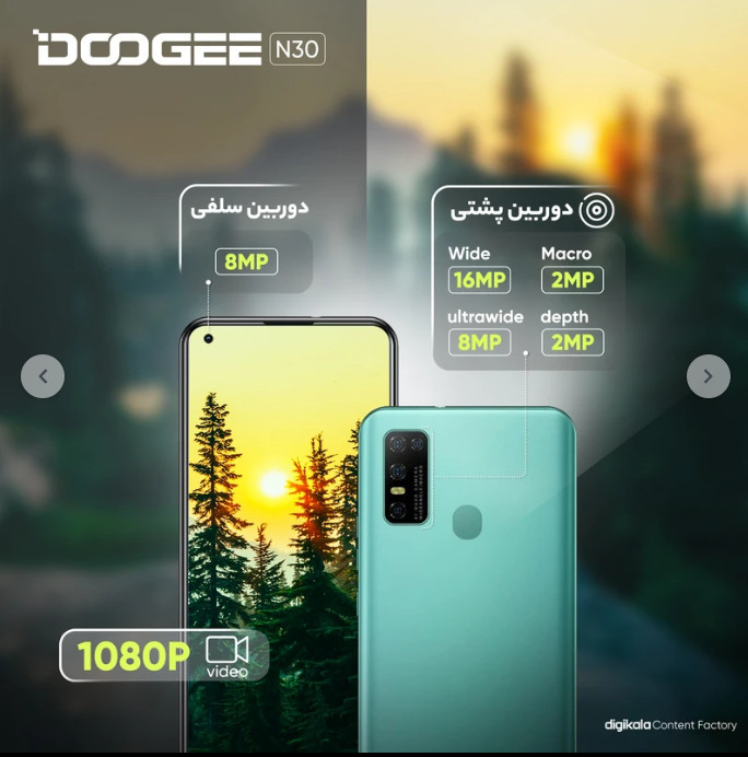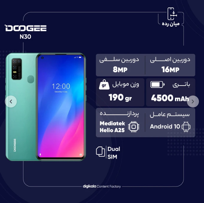 گوشیهای هوشمند شرکت DOOGEE را به مقاومت و استقامت بالا در شرایط سخت میشناسیم. اما در میان محصولات این شرکت، شاهد رونمایی برخی گوشیهای هوشمند میانردهای بودیم که به نسبت قیمت در نظر گرفته شده، از مشخصات فنی مناسب و قابل قبولی بهره برده بودند. یکی از این گوشیهای میانرده Doogee N30 است. این گوشی هوشمند میانرده به صفحهنمایش 6.5 اینچ با رزولوشن 720×1600 پیکسل از نوع IPS LCD مجهز شده است. برای طراحی صفحهنمایش هم از ناچ جذاب اینفینیتی O استفاده شده است. در قسمت جلویی برای دوربین سلفی سنسور با رزولوشن 8 مگاپیکسل در نظر گرفته شده است و در قسمت پشتی هم یک سنسور دوربین اصلی 16 مگاپیکسل از نوع عریض در کنار سنسور 8 مگاپیکسل از نوع فوق عریض (ultra wide) و دو سنسور با رزولوشن 2 مگاپیکسل از نوع ماکرو و سنجش عمق، سنسورهای دوربین چهارگانه Doogee N30 را تشکیل میدهند. در بخش مشخصات سختافزاری هم این گوشی به پردازنده میانرده هلیو A25 شرکت مدیاتک مجهز شده است که در اجرای بازیهای نهچندان سنگین و فعالیتهای روزمره، عملکرد قابل قبولی دارد. باتری با میزان ظرفیت 4500 میلیآمپرساعت هم از دیگر مشخصات در نظر گرفته شده برای این گوشی هوشمند میانرده است.