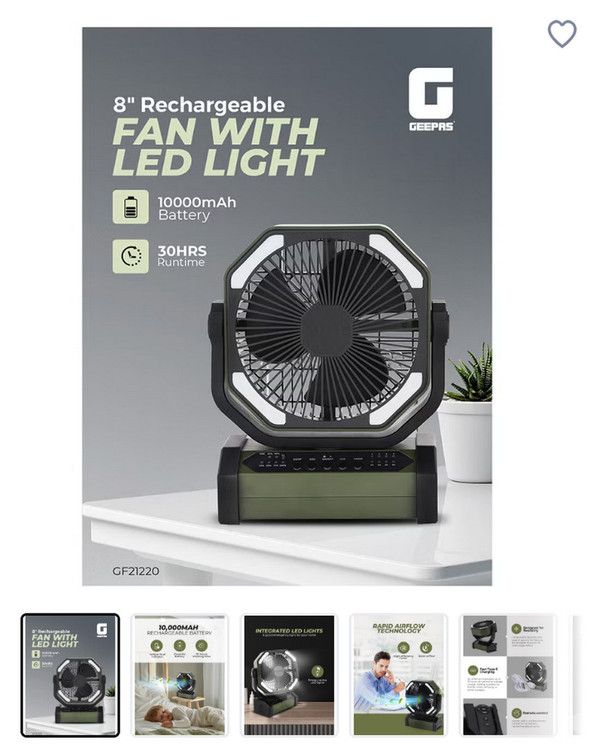| What's In The Box | Geepas 8-Inch Rechargeable Fan , 1 x Remote Control 1 x USB Charging Cable 1 x User Manual 1 x Warranty Card |