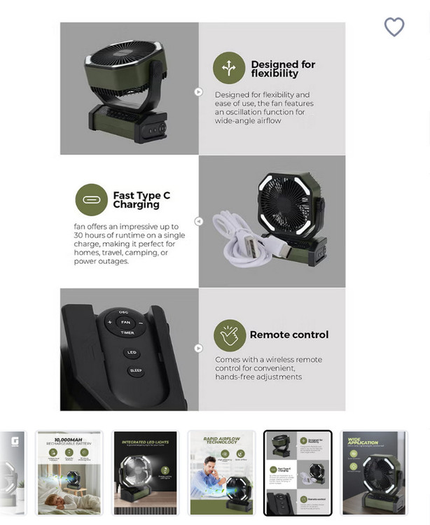 این پنکه که با یک باتری لیتیوم-یونی قوی ۱۰۰۰۰ میلیآمپرساعتی کار میکند، تا ۳۰ ساعت در سرعت کم و تا ۴ ساعت در سرعت بالا کار میکند و آن را به همراهی ایدهآل برای استفاده اضطراری، سفرهای کمپینگ یا روزهای گرم تابستان تبدیل میکند. عملکرد نوسانی امکان گردش هوای گستردهتر، پوشش فضای بیشتر و راحتی بیشتر در مقایسه با پنکههای ثابت را فراهم میکند.
