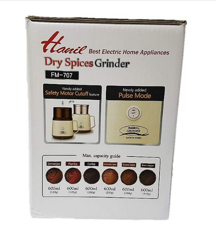 بدنه استیل ضد زنگ: دوام فولاد دو برابر قوی تر و ضد خش است. اکنون می توان غذای تمیز تری را بدون بوی فلز درست کرد. CUTOFF موتور ایمنی: ویژگی جدید اضافه شده امکان قطع شدن موتور را در صورت بسته نشدن درب به درستی فراهم میکند. هانیل مدل FM-707 با ظرفیت 600 میلی لیتر امکان آسیاب کردن دانه های قهوه، ادویه و فلفل خشک هم اکنون به سرعت انجام می شود.