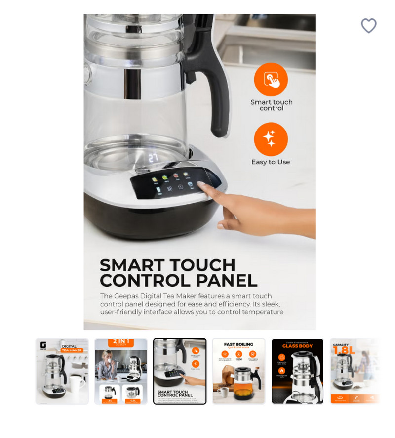 چایساز دیجیتال با پنل کنترل لمسی هوشمند، توان ۱۵۰۰ وات | دارای سیستم محافظت در برابر گرم شدن بیش از حد، شامل کتری ۱٫۸ لیتری + قوری شیشهای ۰٫۹ لیتری | بدنه شیشهای مقاوم، تنظیمات چندگانه دما، المنت حرارتی استیل ضدزنگ | مدل GTM38079، رنگ شفاف و مشکی