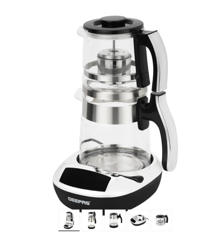 چایساز دیجیتال با پنل کنترل لمسی هوشمند، توان ۱۵۰۰ وات | دارای سیستم محافظت در برابر گرم شدن بیش از حد، شامل کتری ۱٫۸ لیتری + قوری شیشهای ۰٫۹ لیتری | بدنه شیشهای مقاوم، تنظیمات چندگانه دما، المنت حرارتی استیل ضدزنگ | ، رنگ شفاف و مشکی