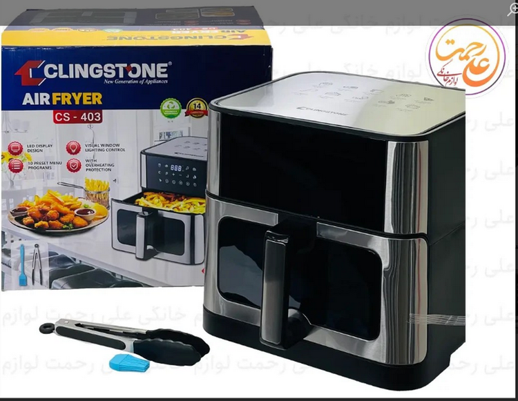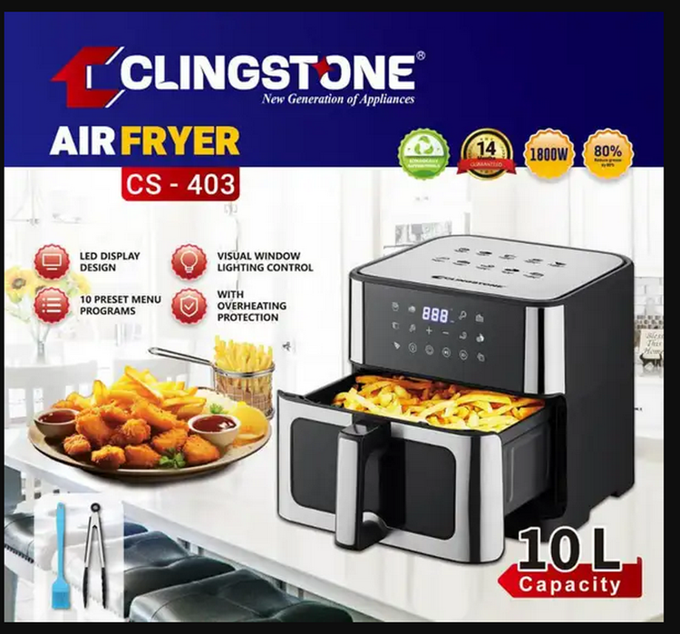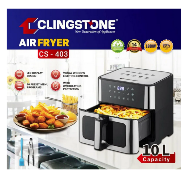سرخکن 10 لیتری کلینگستون مدل CS-403 با توان 1800 وات و طراحی داخلی استیل، مناسب برای پخت سریع و سالم با تکنولوژی هوای داغ و نمایشگر LED.