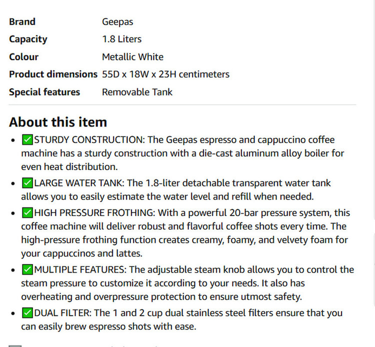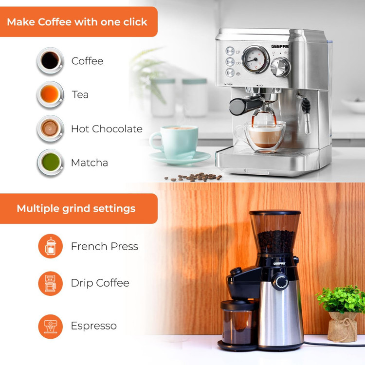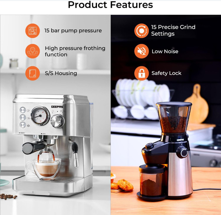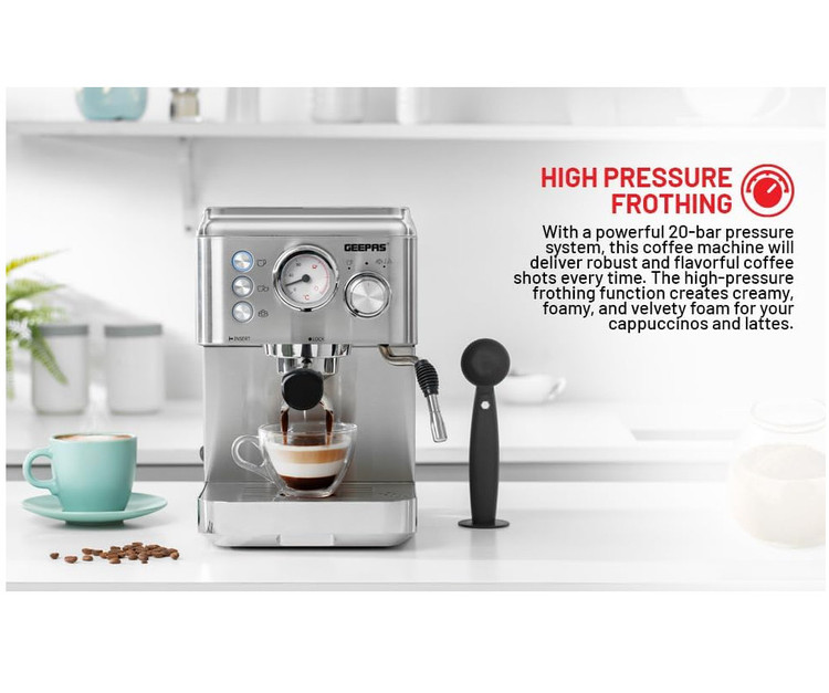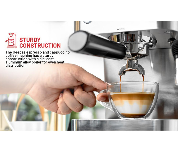 The Geepas espresso and cappuccino coffee machine has a sturdy construction with a die-cast aluminum alloy boiler for even heat distribution.