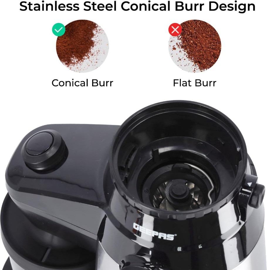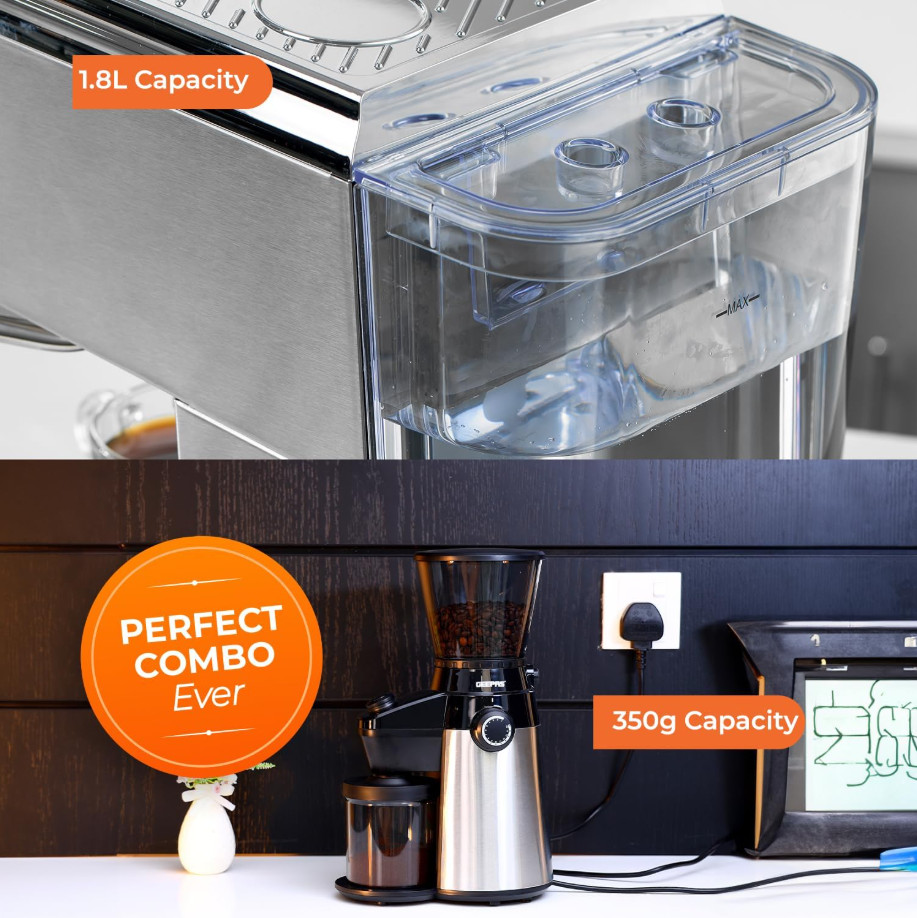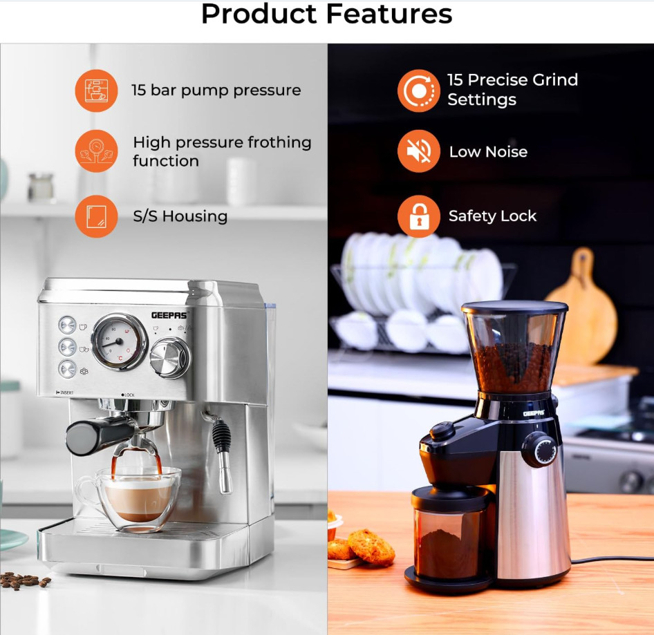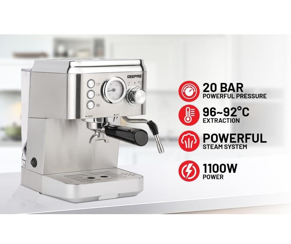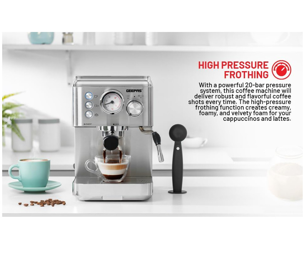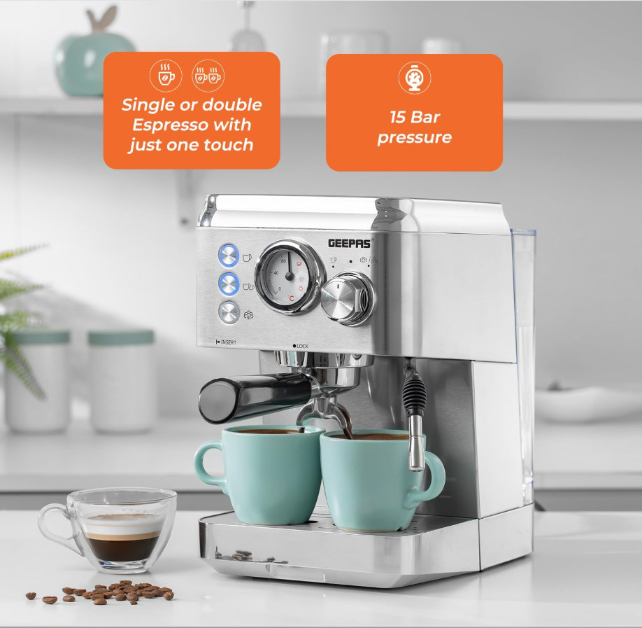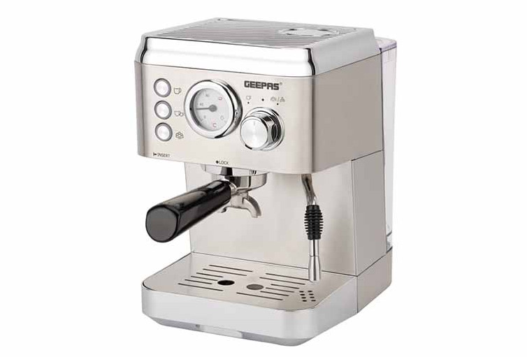 The Geepas espresso and cappuccino coffee machine has a sturdy construction with a die-cast aluminum alloy boiler for even heat distribution.