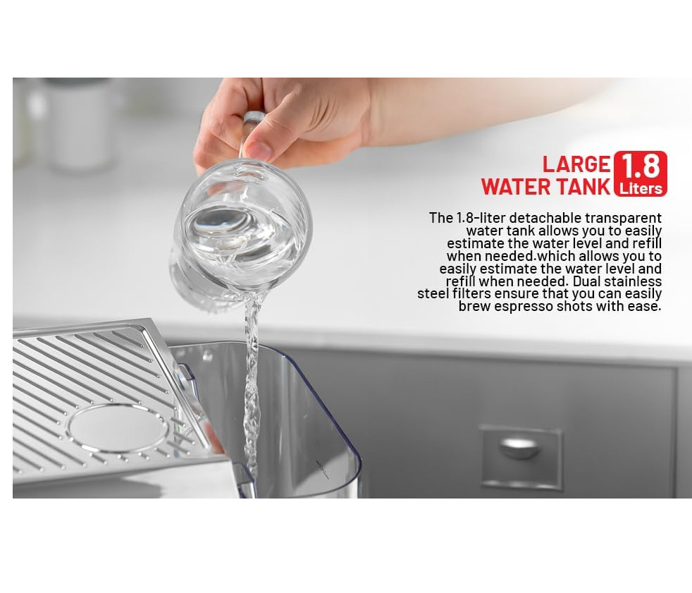 مخزن آب بزرگ: مخزن آب شفاف و قابل جدا شدن ۱.۸ لیتری به شما این امکان را میدهد که به راحتی سطح آب را تخمین زده و در صورت نیاز دوباره پر کنید.