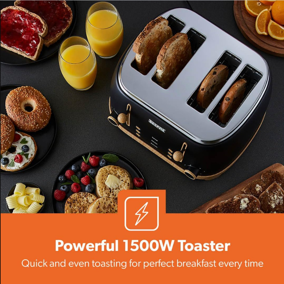 توستر ۴ خانه + کتری برقی ۱.۷ لیتری | طراحی اسکاندیناویایی | مشکی مات با جزئیات چوبی