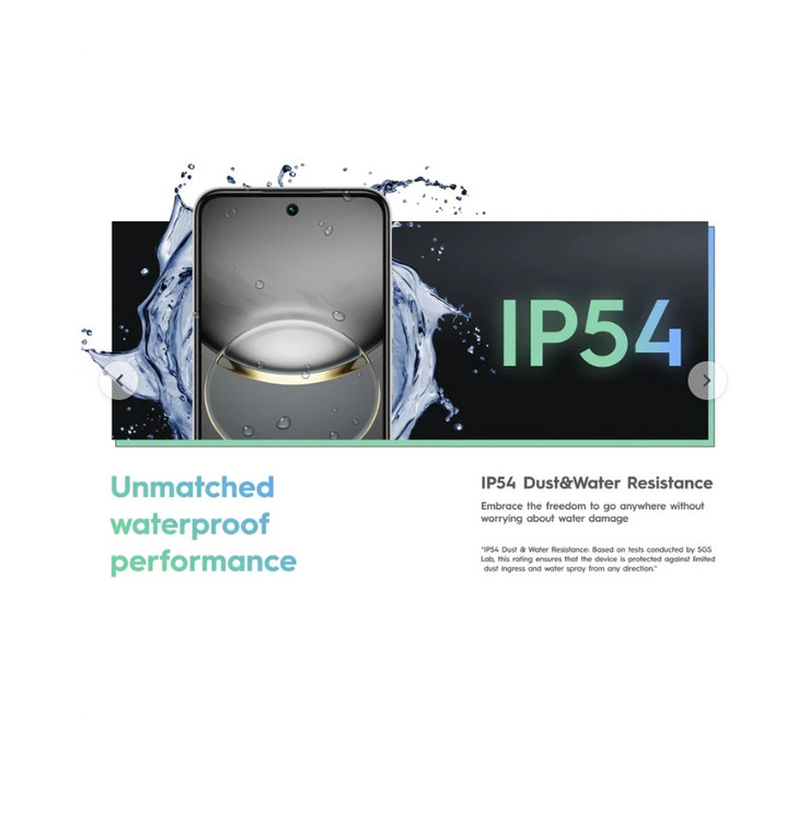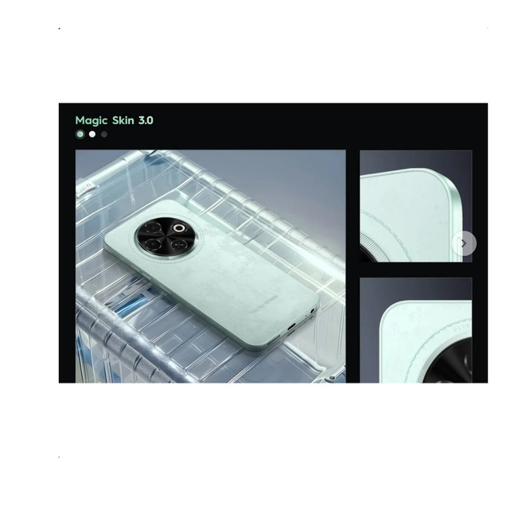تکنو در Spark 30C از زبان طراحی جدید خود استفاده کرده که ماژول دوربین بزرگ و دایرهایشکل در مرکز قاب پشتی، در همان نگاه اول توجه شما را جلب میکند. نوار رنگی LED در رنگ سفید و نوار براق در دو رنگ دیگر، جلوهای مدرن به دستگاه داده است. بدنه گوشی از پلاستیک مقاوم ساخته شده و در ترکیب با فریم براق، حس خوشدستی و زیبایی مناسبی را ارائه میدهد. وجود گواهی IP54 نیز نشان میدهد Spark 30C در برابر گرد و غبار و پاشش آب مقاوم است و این ویژگی در این بازه قیمتی کمتر دیده میشود.