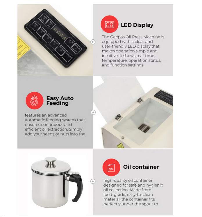 معرفی دستگاه روغنگیری خانگی Geepas GOP63091 - دستگاهی با کارایی بالا و کاربرپسند که برای کمک به شما در لذت بردن از مزایای استخراج روغن تازه و طبیعی در راحتی خانهتان طراحی شده است. این دستگاه روغنگیری پیشرفته، طراحی هوشمند، ساختار مستحکم و عملکرد قدرتمند را با هم ترکیب میکند و آن را به همراهی ایدهآل برای افراد و خانوادههای آگاه به سلامت تبدیل میکند که به دنبال خلوص و کیفیت در روغن پخت و پز روزانه خود هستند.
