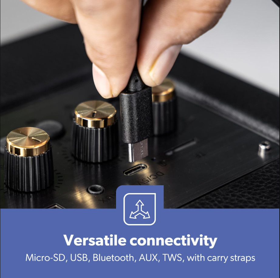 اتصال فوری و بدون لگ به موبایل، تبلت یا لپتاپ. پشتیبانی از USB، TF، AUX، FM و TWS برای آزادی کامل در پخش موسیقی.