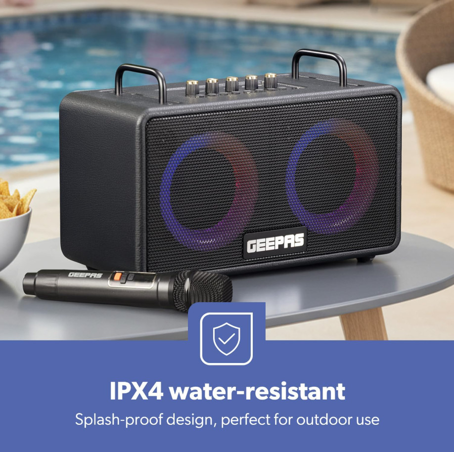 قابل حمل، مقاوم (IPX4) و مناسب استفاده در خانه، سفر، پیکنیک و جشنها.