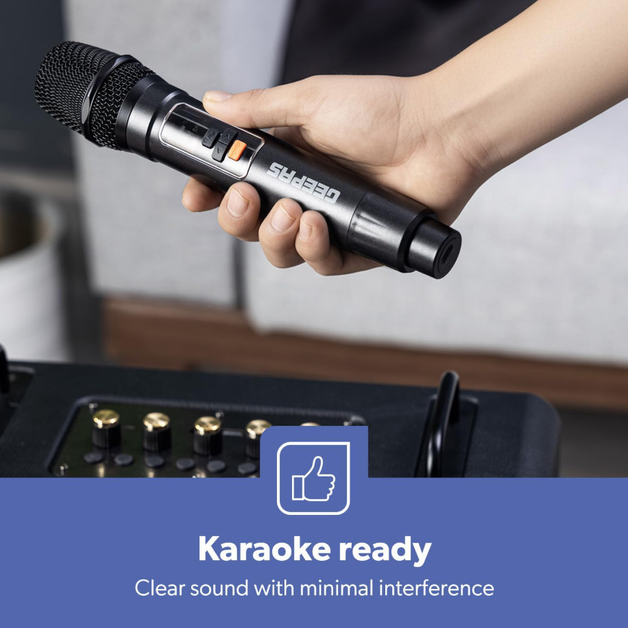 Includes a UHF mic for clear, powerful vocals. Perfect wireless Bluetooth setup for karaoke, parties, and events.