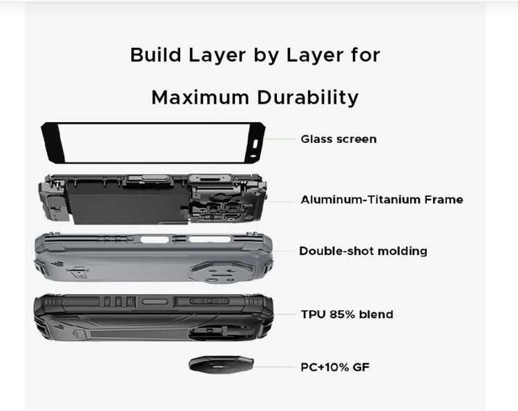 این گوشی با دریافت استاندارد نظامی MIL‑STD‑810H و گواهیهای IP68 و IP69K، در برابر آب، گردوغبار، ضربه و فشار بالا کاملاً مقاوم است.