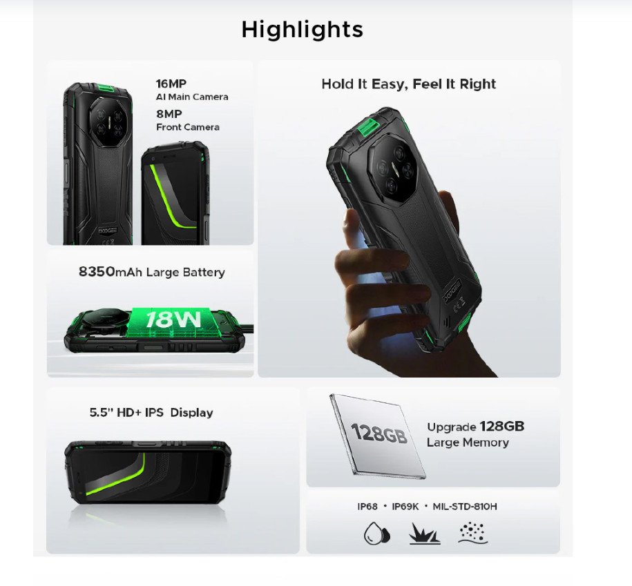 این گوشی با دریافت استاندارد نظامی MIL‑STD‑810H و گواهیهای IP68 و IP69K، در برابر آب، گردوغبار، ضربه و فشار بالا کاملاً مقاوم است.