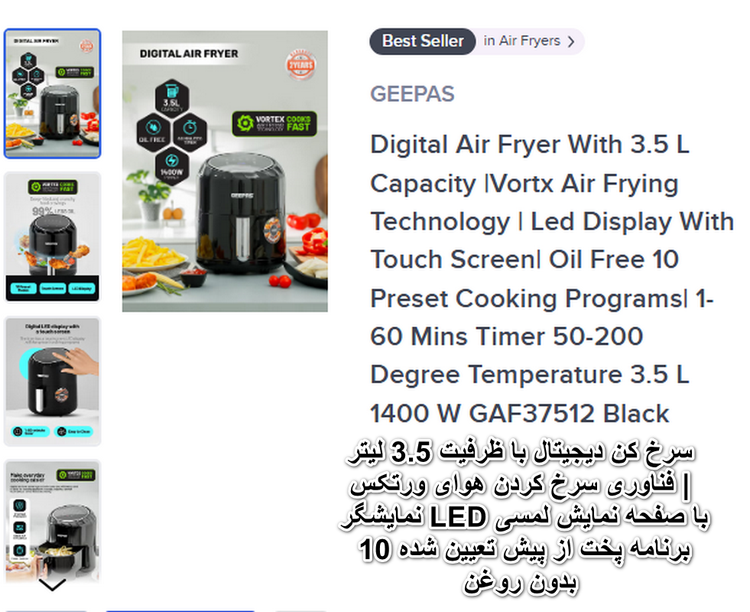 با فناوری گردش هوای سریع Vortex در سرخ کن بدون روغن جیپاس مدل GAF37512N، میتوانید غذاهای مورد علاقه خود را 30 درصد سریعتر و سالمتر تهیه کنید. هوای داغ برای پخت یکنواختتر غذا و ایجاد نتایج ترد در حالی که تا 99 درصد روغن کمتری مصرف میکنید، فقط چربی را از دست میدهید اما همچنان همان چیپس ترد و بالهای مرغ آبدار را دریافت میکنید. از پیش تنظیم غذا برای پخت ساده لذت ببرید، طیف وسیعی از ظروف را میتوان به سرعت و بدون دردسر بر روی یک صفحه نمایش دیجیتال لمسی داخلی با 10 برنامه پخت از پیش تنظیم شده طبخ کرد. همچنین امکان تنظیم محدوده دمایی بین 50-200 درجه سانتیگراد و تایمر 60 دقیقه را فراهم میکند. از برگرهای آبدار، استیک، سوسیس قهوه ای طلایی، ناگت مرغ خوشمزه، سیب زمینی سرخ کرده ترد لذت ببرید. با طراحی کم مصرف سرخ کن بدون روغن جیپاس مدل GAF37512N مصرف برق خود را تا 55 درصد کاهش دهید که هزینه انرژی شما را کاهش میدهد. Geepas متعهد است که روش ارزان تری برای پخت و پز ارائه دهد. دستور العمل ها مطابق انتظارات شما برای سرخ کردن، کباب کردن، برشته کردن و پخت در هوا هستند.