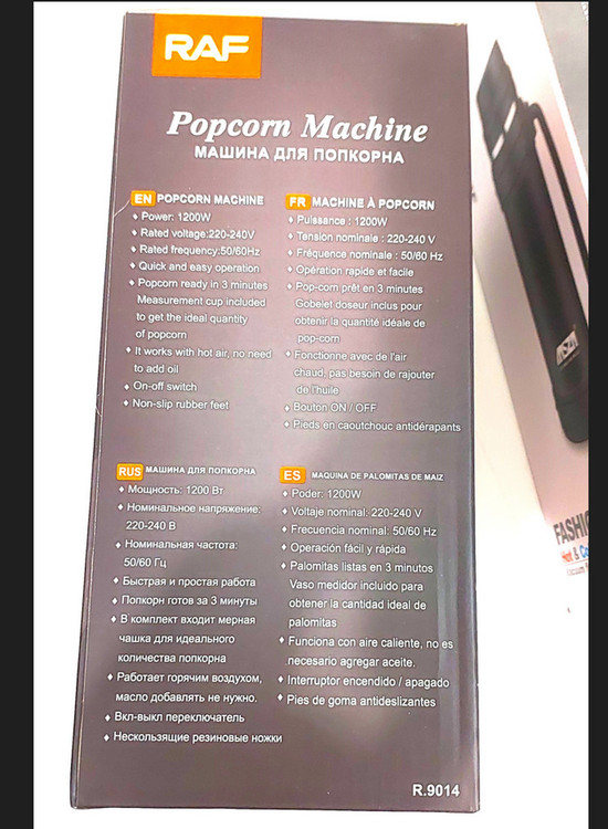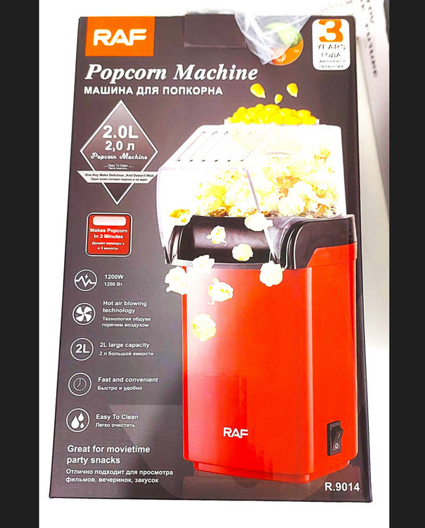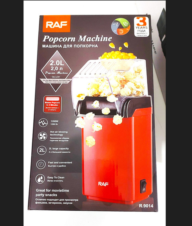 RAF 3 را بردارید دستگاه پاپ کورن دستگاه پاپ کورن دستگاه پاپ کورن 2.0 لیتری 2.0 لیتری پاپ کورن را در 3 دقیقه درست می کند 1200 وات 1200 وات تکنولوژی دمیدن هوای گرم تکنولوژی هوای گرم 2 لیتر ظرفیت بزرگ 2 لیتر ظرفیت بزرگ سریع و راحت سریع و راحت آسان تمیز میشود برای میان وعده های مهمانی در زمان فیلم عالی است عالی برای تماشای فیلم، مهمانی، تنقلات RAF R.9014