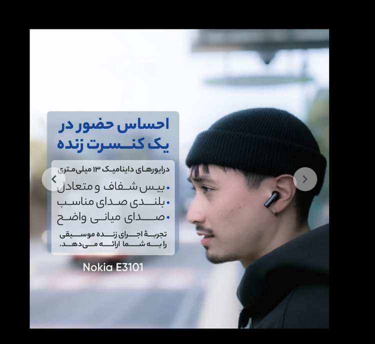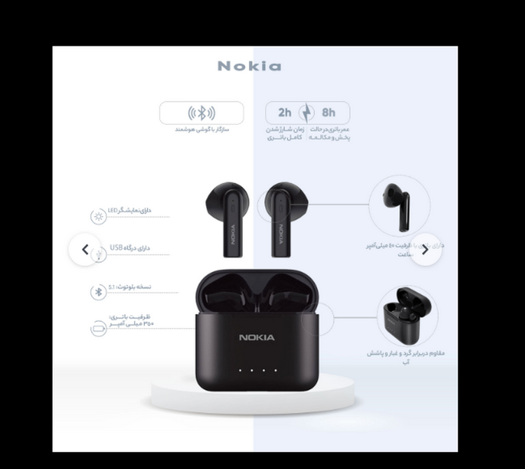 هدفون بلوتوثی نوکیا مدل E3101 دارای درایورهای 13 میلیمتری با بالاترین کیفیت، میانههای واضح، بیس متعادل و شفاف است که باعث میشود احساس کنید در یک کنسرت زنده ایستادهاید. بلوتوث 5.1 و عملکرد جفت شدن خودکار گوشیهای شما را در یک لحظه متصل میکند. با اتصال یکپارچه و 30 فوت محدوده گوش دادن بیسیم، آزادی کامل را با هدفون به شما میدهد. دستیار مطمئن شما فرمان صوتی دارد. با Google Assistant و سازگاری Siri، مسیرها را دریافت کنید، تقویم خود را بررسی کنید یا بدون نیاز به بیرون آوردن تلفن همراه خود تماس بگیرید. این هدفون از طراحی ضد رطوبت IP44 بهرهمند است، به این معنی که باران یا عرق ماراتن موسیقی، تماسها یا تمرین شما را مختل نمیکند. همچنین، تا پنج ساعت به صورت پیوسته و با یکبار شارژ و با استفاده از محفظه شارژر جمعوجور، میتوانید سه بار هدفون را شارژ کنید. نشانگر قدرت LED این محفظه ظرفیت باتری باقیمانده را نمایش میدهد، بنابراین هرگز نگران تمام شدن شارژ خود به صورت ناگهانی نباشید.
