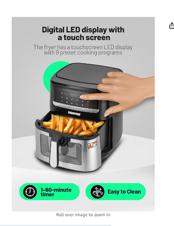 ظرفیت بزرگ: سرخ کن دیجیتال 9.2 لیتری با قفسه و روکش نچسب که برای تهیه یک وعده غذایی خانوادگی برای تهیه خوشمزه ترین غذاها و تنقلات بدون روغن و تا 80 درصد چربی کمتر مناسب است. برای پخت غذای کاملا پخته، سالم و کم چرب بدون روغن برای کل خانواده ایده آل است.