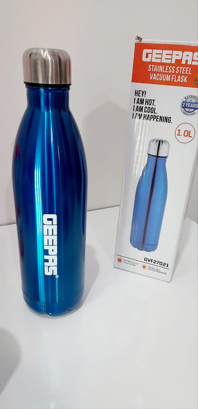 1) بطری آب استیل ضد زنگ: با بطری خلاء Geepas هیدراته بمانید. دارای طراحی درب ایمن و ضد نشتی برای جلوگیری از ریختن کثیف. این بطری عایق با ظرفیت 1.0 لیتر، نیازهای هیدراتاسیون شما را برای کل روز تامین می کند.