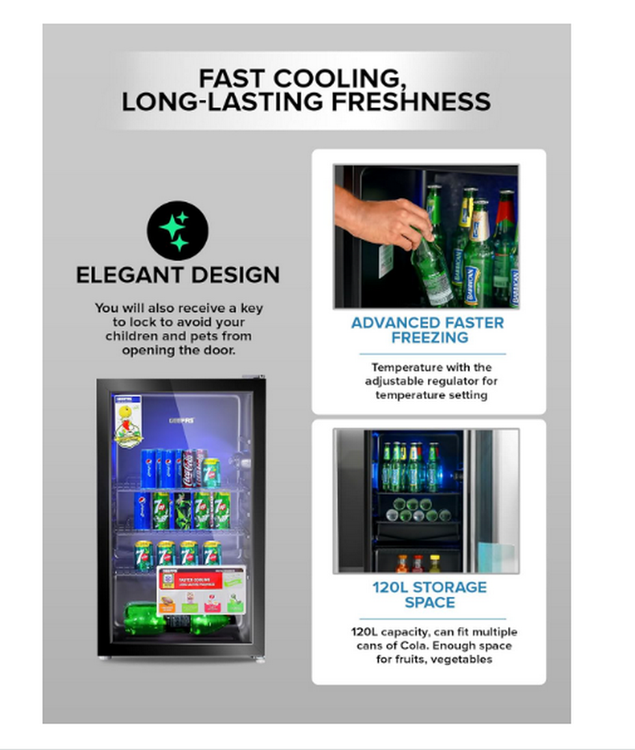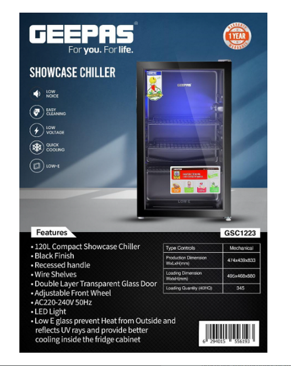 چیلر ویترین Geepas که برای راحتی طراحی شده است، حداکثر سرمایش را با حداقل مصرف انرژی ارائه می دهد. چیلر با طراحی باکیفیت و ویژگی های کاربردی متعدد خود از بقیه متمایز است و راه حل نهایی برای نگهداری و نمایش نوشیدنی ها، تنقلات و سایر کالاهای خنک است. از ویژگی های این گوشی می توان به شیشه کم E، کارکرد با صدای کم، مصرف ولتاژ پایین، درب شیشه ای دولایه، چراغ های LED داخلی و موارد دیگر اشاره کرد. چیلر جدید طراحی شده با فناوری خنک کننده سریع نوشیدنی های شما را در تمام طول روز خنک و تازه نگه می دارد و طعم ها را حفظ می کند. این چیلر که از مرغوب ترین مواد ساخته شده است، بسیار بادوام بوده و عمر طولانی دارد. این چیلر دارای ظرفیت 120 لیتری است و برای نوشابه، آبمیوه، نوشیدنی، کیک، شیرینی و غیره ایده آل است. این چیلر ویترینی با روکش مشکی براق و درب شیشه ای شفاف دولایه، افزودنی مناسب برای هر فضایی است. چیلر مناسب منازل، رستوران ها، سوپرمارکت ها، مغازه ها و غیره است. با صدای کم، چیلر مزاحم نمی شود. دستگیره فرورفته باز و بسته شدن در را آسان می کند و قفسه های سیمی را می توان مطابق با نیازهای شما تنظیم کرد. علاوه بر این، شیشه Low-E روی در از گرمای بیرون جلوگیری می کند و اشعه UV را منعکس می کند تا خنک کننده بهتری در داخل کابینت چیلر ایجاد کند. دارای یک چراغ LED داخلی است که چیلر را روشن می کند و به شما کمک می کند کارها را راحت تر پیدا کنید. چیلر با مصرف انرژی کمی کار می کند و مقرون به صرفه است. طراحی ساده و زیبا جلوه فضا را بیشتر می کند و یک تجربه خنک کننده راحت ایجاد می کند. این چیلر با تکنولوژی مدرن نوشیدنی ها را خنک نگه می دارد، بنابراین می توانید حتی در تابستان از آبمیوه خنک لذت ببرید. چیلر ویترینی Geepas دارای 1 سال گارانتی، ابعاد 474x439x833 میلی متر و وزن 24 کیلوگرم است.