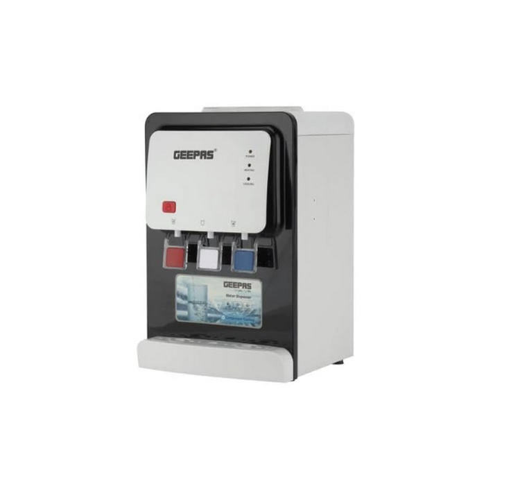 آب سردکن رومیزی Geepas- GWD17022/ عملکرد معمولی، گرم و سرد، و 3 شیر، مخزن استیل ضد زنگ| برای خانه، مدرسه، آپارتمان، دفتر و غیره/ سفید و مشکی