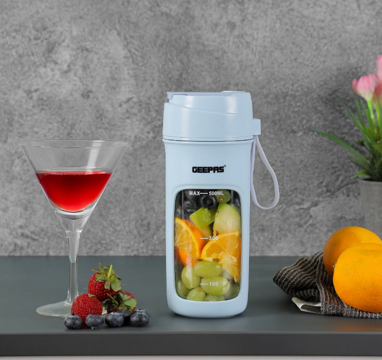 مخلوط کن قابل حمل قابل شارژ Geepas- GSB44073N/ ظرفیت 500 میلی لیتر، دستگاه آب گیری پرتقال، لیمو، گریپ فروت، شیک، اسموتی و غیره/ 6 تیغه فولادی ضد زنگ، موتور قدرتمند، قفل ایمنی