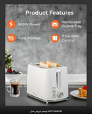 تنظیم سایه نان با نشانگرهای LED - با یک چرخش ساده صفحه، 7 کنترل قهوه ای قابل تنظیم کاملاً ترجیحات فردی را از قهوه ای روشن تا تیره و همچنین تردی را در خود جای می دهد. نشانگرهای LED انتخاب یک تنظیمات سایه دار را واضح و آسان می کنند.2) 3 دکمه برای عملکردهای برشته کردن چندگانه - توستر 2 تکه دارای 3 دکمه برای عملکردهای یخ زدایی، گرم کردن مجدد و لغو است. عملکرد یخ زدایی ابتدا برای یخ زدایی و سپس برشته کردن نان یخ زده است. دکمه گرم کردن مجدد به شما امکان می دهد نان خود را به سرعت گرم کنید بدون اینکه بسوزد در حالی که لغو فرآیند برشته کردن را در هر زمان متوقف می کند. آسان برای استفاده.3) شکاف های بسیار عریض و اهرم بالابر بالا - شکاف های برشته برای انواع نان و برش های ضخیم تر، مانند نان تست فرانسوی (ضخیم و نازک)، کلوچه، پنکیک یخ زده و شیرینی های توستر طراحی شده اند. هنگامی که برشته کردن به پایان رسید، اهرم کالسکه اضافی به طور خودکار بالا میآید و با خیال راحت نان را بالا میبرد و قطعات کوچک را نیز جدا میکند.